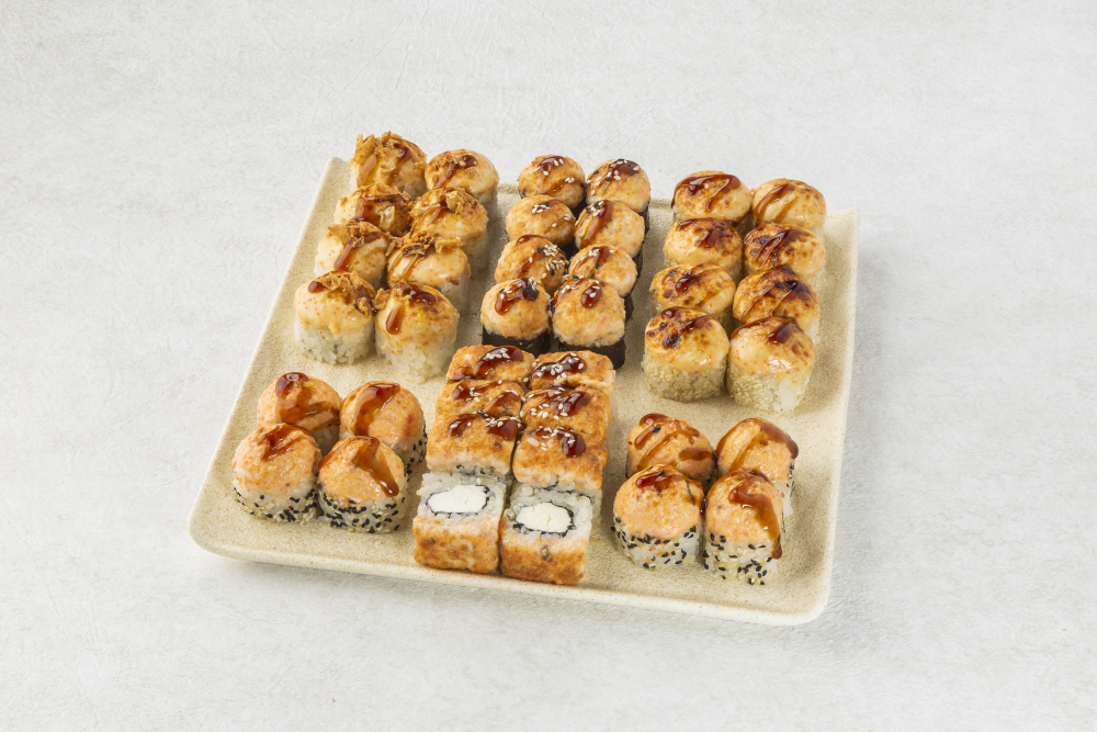 Запечённый набор: Аки Ролл (снежный краб), Саке Кани (лосось гриль, снежный краб), Чизу Ролл (кура), Абико (лосось гриль), Запечённая Филадельфия (лосось гриль); 40 шт.