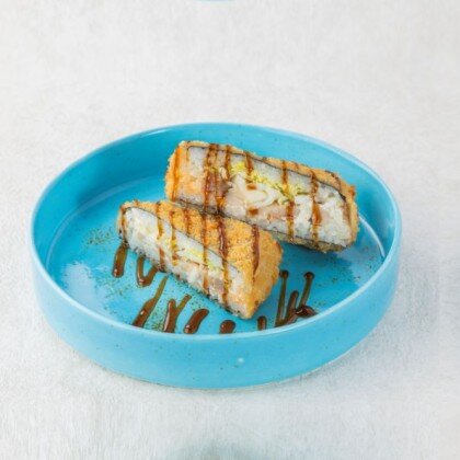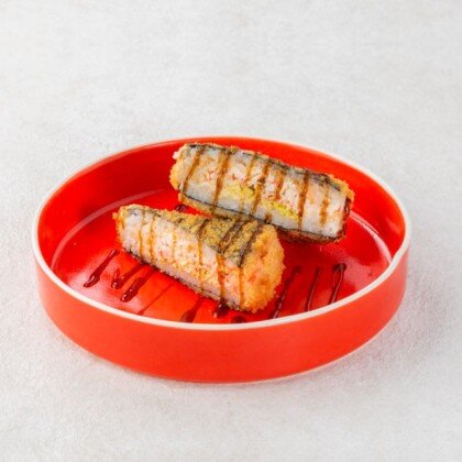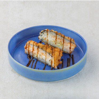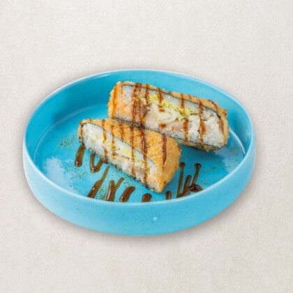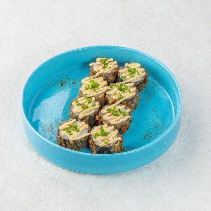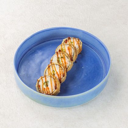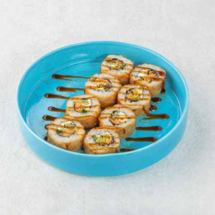 Снежный краб, сыр чеддер, сливочный сыр, огурец, соус шрирача, соус унаги, зелёный лук, кунжут, рис, нори; 8 шт.